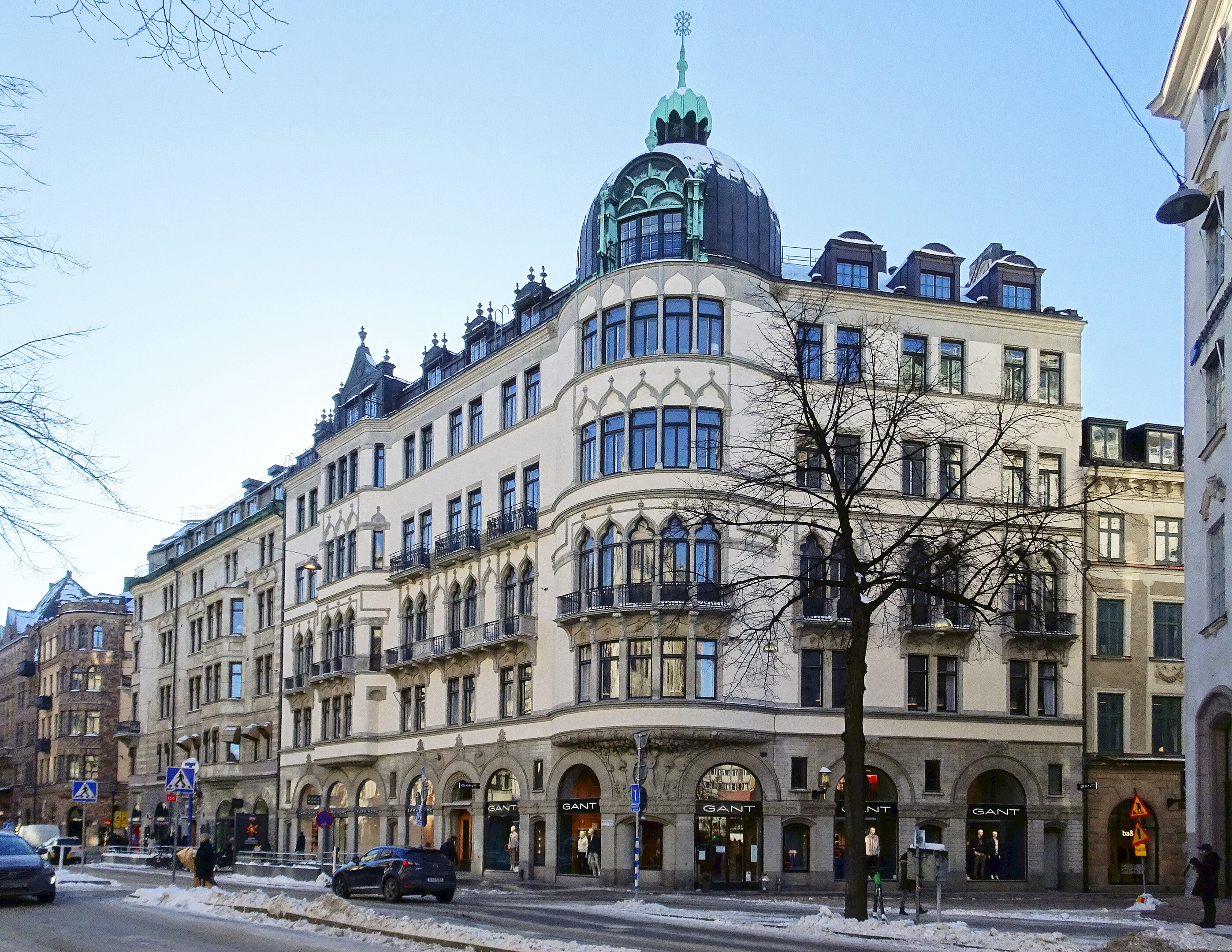 Kvarteret Pumpstocken sett från Birger Jarlsgatan med Bocanderska palatset längst fram, februari 2021